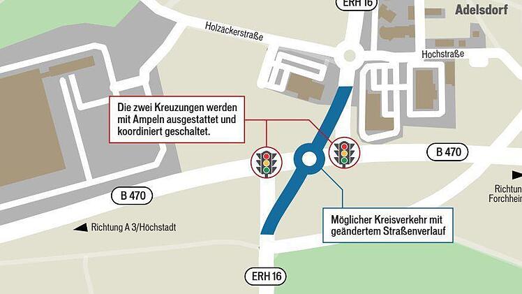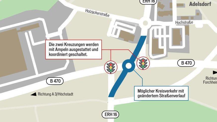 Auf der B470 sollen an den Einmündungen nach Neuhaus und nach Adelsdorf Ampelanlagen entstehen. Nun wird die Forderung nach einem Kreisverkehr laut.