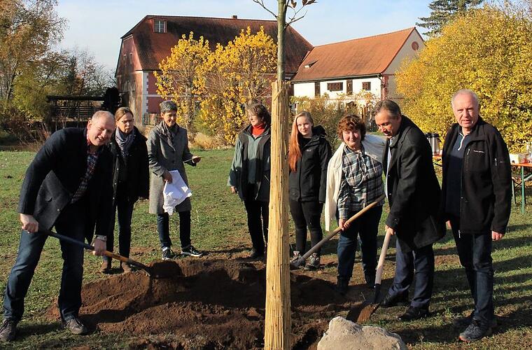 Der Baum brauche viel Platz, Licht und Wärme, so dass er sich ausbreiten könne, erklärte Helmert. Der Standort vor der Mühle sei daher ideal. Dazu hat die Esskastanie in unmittelbarer Nähe einen Walnussbaum und - die Vorsitzende des Obst- und Gartenbauvereins, Sonja Peschke, die ein Auge auf den Baum hat.