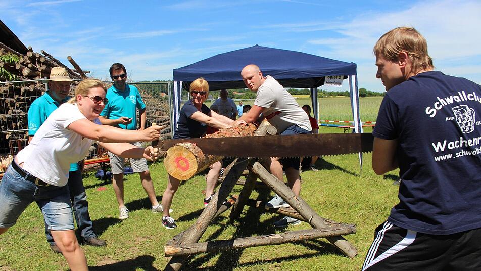 Nachdem die Waldeslust-Kids ihre bunt geschmückte Fichte aufgestellt hatten, waren die Erwachsenen bei einer "Olympiade" gefordert. Dem Wettbewerb nach Punkten stellten sich unter anderem Teams vom Kerwasverein und vom Schwallclub Wachenroth, zwei Mannschaften des Vereins "Zufriedenheit Simmersdorf", der Turnverein Jahn 07 Mühlhausen, der Verein "Mir sen mir" aus Treppendorf, sowie mehrere Feuerwehrmannschaften.