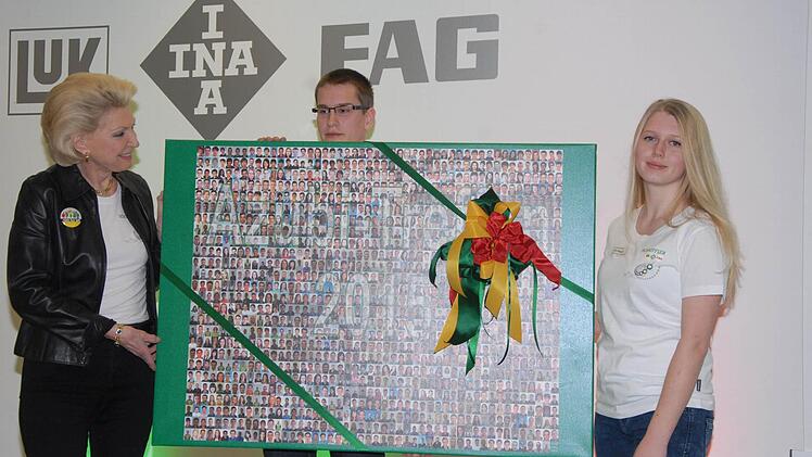 Die Firmenchefin selbst nahm gern das Bad in der Menge, für ein Gruppenfoto mit allen 1100 Auszubildenden, die mit ihren rund hundert Betreuern gekommen waren. Und bedankte sich mit Küsschen für die Geschenke der Azubis, und deren kurzen Worte, die alle artig und höflich waren, aber nicht weniger spontan. Das "herzliche Servus aus Österreich" eines jungen Mannes aus dem dortigen Werk, die plötzliche Umarmung einer Auszubildenden oder auch das großformatige Bild mit den Porträts der Azubis - all das waren Zeichen der Verbundenheit der Schaeffler-Familie mit ihrer Chefin.