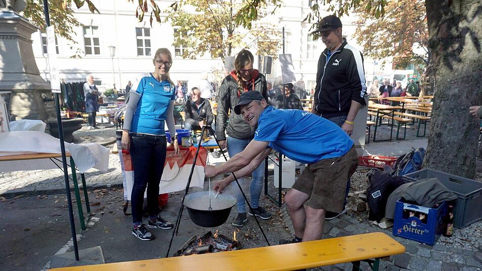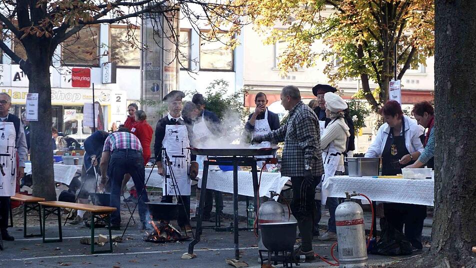 Wenn Wolfsberg feiert, dann ist auch immer viel Geselligkeit geboten. Im festlichen Mittelpunkt freilich stand am Vorabend die Feier zum 50-jährigen Partnerschaftsjubiläum beider Städte. Bereits am frühen Morgen wurden am nächsten Tag die Feuer auf dem Weiherplatz geschürt und die Zutaten gerichtet. Dann hieß es rühren, rühren und nochmal rühren. Vom "Saualm-Duo" musikalisch begleitet und von Thomas Schmid humorvoll moderiert, dauerte es nahezu drei Stunden, bis die Jury, darunter auch die Bürgermeister German Hacker und Klaus-Peter Schlagholz sowie Kaplan Christoph Kranitzky, am Jurytisch Platz nahmen und ihr Urteil über die 25 Proben fällen mussten.