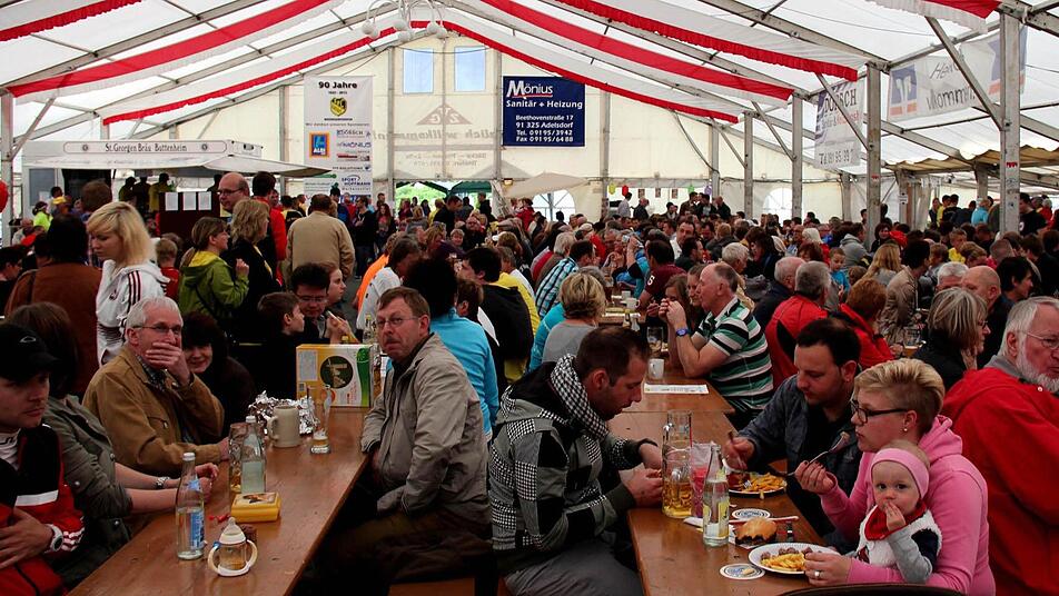 Das Wetter spielte mit Am Donnerstag, pünktlich um 11 Uhr, begann das große Familienfest jedoch mit strahlendem Sonnenschein. Draußen vor dem Zelt wurde auf einem kleinen Feld Fußball gespielt, gegenüber fand nostalgisches Freiluftkegeln statt, die Hüpfburg schwankte unter dem Gehopse der Kinder.