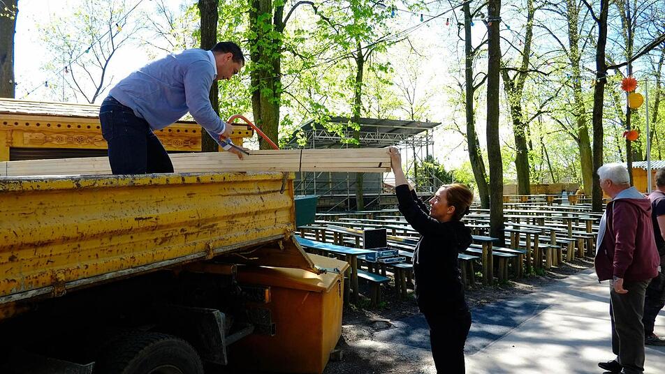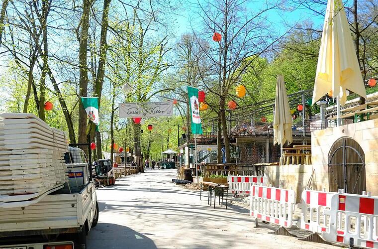 Hier wird gehämmert, da wird geschraubt. Auch Michael und Johannes von dem Keller der Erlanger Traditionsbrauerei "Steinbach" schwingen Hammer und Pinsel im Schatten der Bäume. "Es gibt viel zu tun. Trödeln dürfen wir nicht", erzählt Michael und taucht mit dem dicken Pinsel in den Eimer mit der Farbe. Am 12. Mai beginnt die Bergkirchweih 2016. "Im Moment streichen wir die ganzen Bierbänke", sagt Johannes und zeigt auf die vielen Holzbänke, die sich dicht an dicht den Hang der Burgberges hinauf über den alten Bierkellern verteilen.