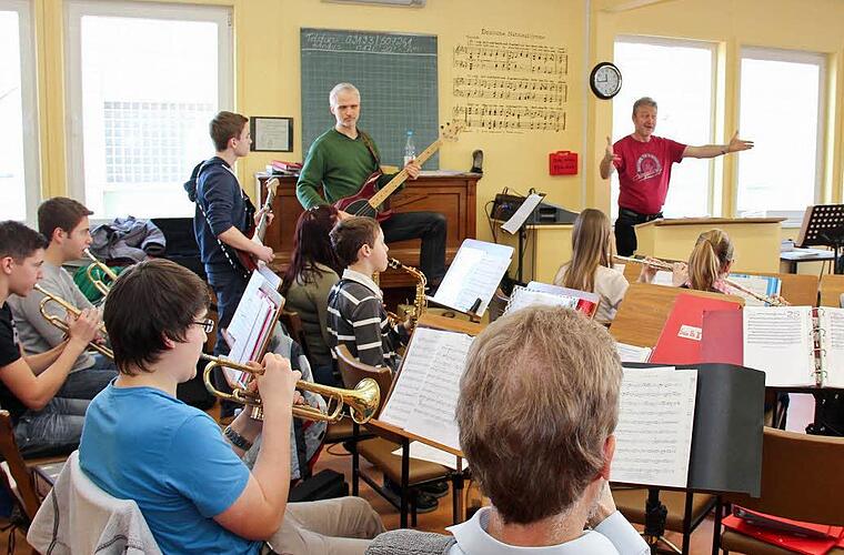 In der Freizeit Bei der Probe sind jugendliche und erwachsene Schüler der Musikschule und der Bläserklassen, die mit viel Freude dabei sind. Immerhin ist es Samstagvormittag und da könnte man ja was anderes machen!