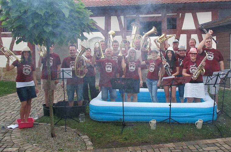 Und so standen die eifrigen Mitglieder der Blaskapelle Zentbechhofen mit hochgekrempelten Hosen im mit Wasser gefüllten Planschbecken. Wer nicht mehr reinpasste, bekam sein eigenes Wännchen. Das alles im gemütlichen Ambiente des Pfarrhofs.
