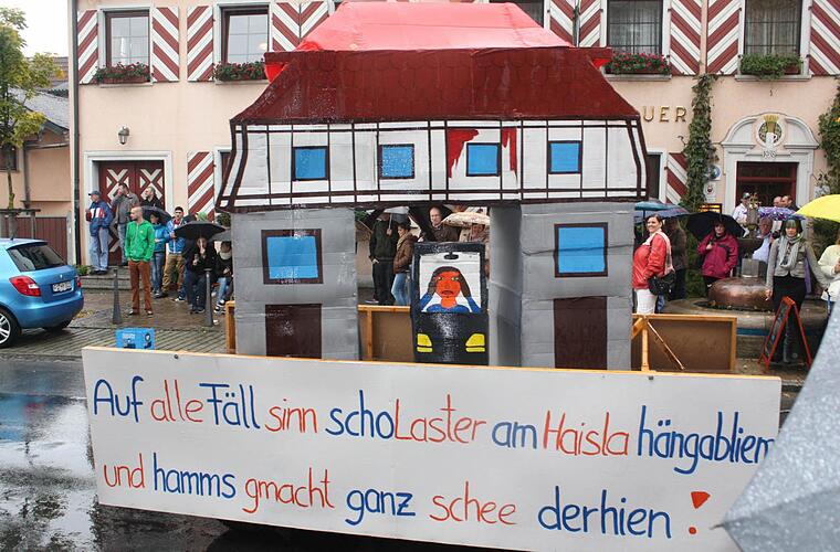Hindern lassen haben sich die "Zaungäste" auch nicht am Sonntag vom strömenden Regen, als es galt, den Umzug zu betrachten. Die meisten hatten den Regenschirm parat - einige wollten mit einem klappbaren Schutzzelt der Ortsburschen stammwirtschaft Prechtel improvisieren. Da waren aber die Burschen dagegen, Sie benötigten die Plane für die Musik auf dem Wagen, "damit's nicht in die Tuba regnet".