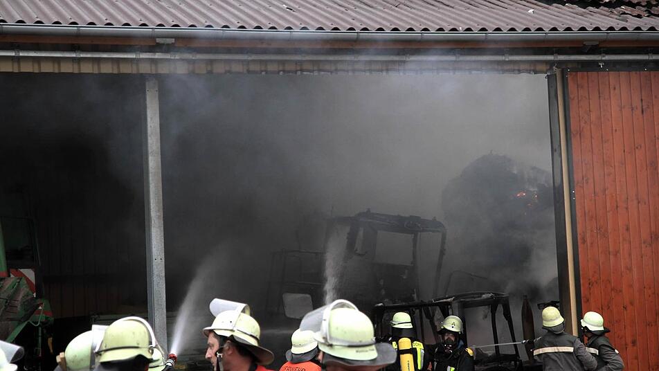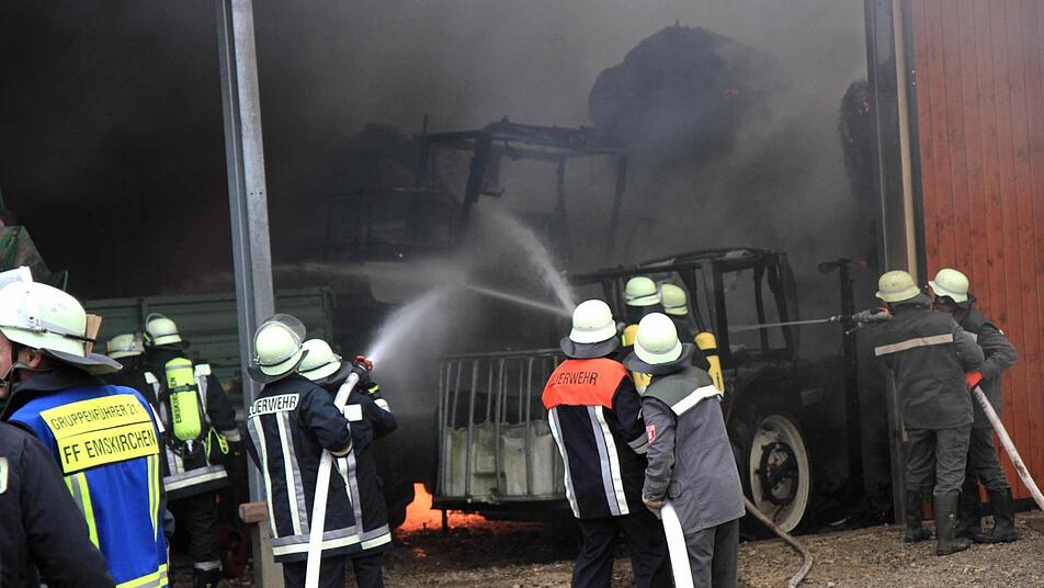 Aus noch unbekannten Gründen war in der Maschinenhalle eines landwirtschaftlichen Anwesens ein Feuer ausgebrochen. In den Strohballen, die in der Halle gelagert waren, fand das Feuer reichlich Nahrung.