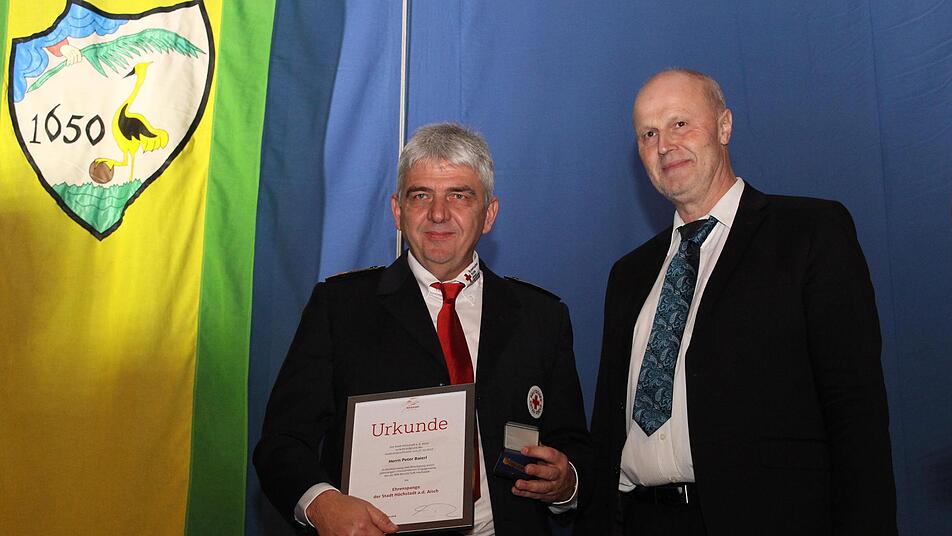 Peter Baierl ist seit über 30 Jahren beim Roten Kreuz in Höchstadt engagiert. Er baute die Schnelleinsatzgruppe mit auf und ist als Bereitschaftsleiter ein nicht wegzudenkender Baustein der Rettungstruppe des BRK in Höchstadt.Die jahrzehntelange ehrenamtliche Arbeit von Andreas Frank in der Schützengilde Höchstadt und als Leiter des evangelischen Seniorentreffs würdigte das Stadtoberhaupt mit einer Urkunde.