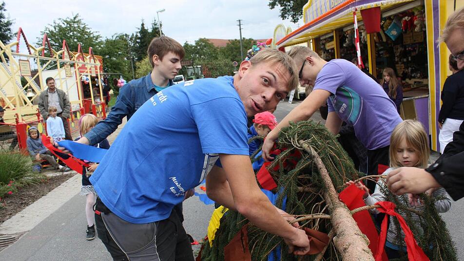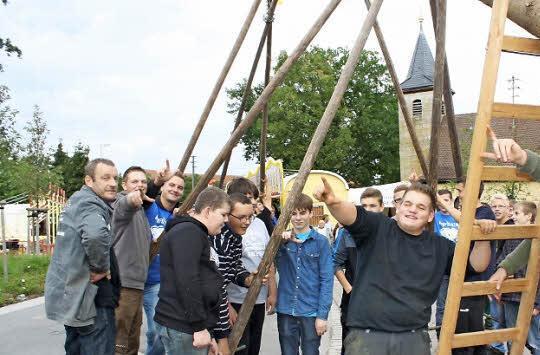 Der "Ervus" ist nach ihren Worten ein bei ihnen gebräuchlicher Gruß und besteht aus der Spanne zwischen Daumen und Zeigefinger. 19,53 Zentimeter lang ist also diese Spanne bei dem, der gemessen hat, rechnet man die Angabe des Feuerwehr-Vereinsvorsitzenden Jochen Kleetz um. Kleetz hatte nämlich 25 Meter angegeben - doch das erschien den fröhlichen Burschen wohl zu gewöhnlich. "Wir sind Bucher und wir haben in Ervus gemessen", so Sven und Lukas stolz. Die Feuerwehr hat die Kerwa organisiert.