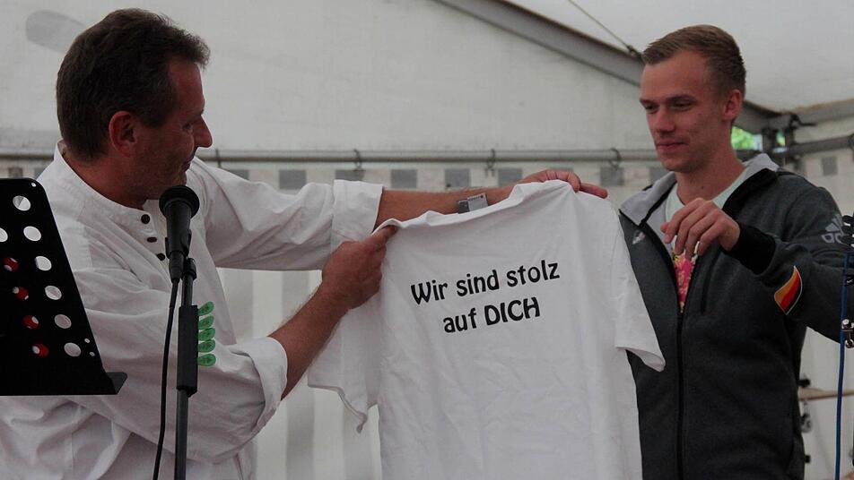 "Martin, Du bist der Größte" Alfons Renker, der 68-jährige Sportler und Mitbegründer der Leichtathletikabteilung im TSV Höchstadt im Jahr 1979, unterhielt die Besucher sowohl mit Volksliedern als auch mit Schlagern aus alten Zeiten. Zum Schluss holte er den wohl berühmtesten Biengartener auf die Bühne: Martin Grau, Deutscher Meister im 3000 Meter Hindernislauf und Studentenweltmeister über 3000 Meter Hindernis bei den Weltstudentenspielen in Gwangju/Südkorea. Für ihn hatte er extra ein Lied gedichtet und komponiert: "Der Martin ist ein Läuferstar!" und alles klatschte begeistert. Als Glückwunschgeschenk überreichte Bernd Schwarz dem erfolgreichen Sportler ein T-Shirt mit der Aufschrift: "Du bist der Größte!", auf dem sich am Abend alle seine Fans verewigen konnten.