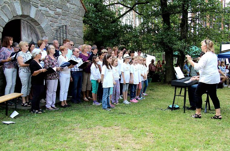 In ihrer Ansprache erinnerte die Vorsitzende an den verstorbenen Adam Gumbmann, dem die Großenseebacher diesen idyllischen Ort zu verdanken haben und der in früheren Jahren an jeder Kapellenkirchweih teilnahm. So war es der Wunsch der Familie Gumbmann, die Kapelle mit Leben zu erfüllen. Dies war dann für den Gesangverein Cäcilia Anlass, seit 1979 hier die Kapellenkirchweih auszurichten. Inzwischen ist es eine feste Einrichtung geworden, an einem Sonntag im Juli dort zusammenzukommen, miteinander fröhlich einen ökumenischen Gottesdienst zu halten und danach vergnügt beieinander zu sitzen. All dieses inmitten von saftigen Wiesen, springenden Karpfen und erntereifem Getreide. Es ist eine Kirchweih besonderer Art - ohne laute, schrille Festmusik, die das Aufeinanderhören unmöglich macht.
