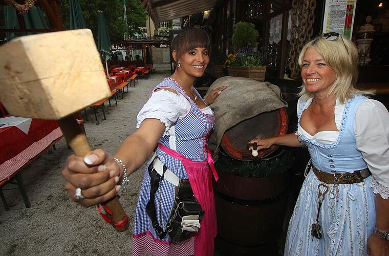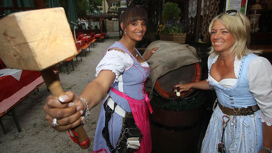 Vier Schläge hat der Oberbürgermeister Siegfried Balleis gebraucht, um das traditionelle Fest auf dem "Erlanger Berg" zu eröffnen. Frankendorf-Wirtin Andrea Dinkel und Kellnerin Jennifer Davis öffneten das erste Fass mit nur zwei Schlägen. Das Fest kann beginnen.