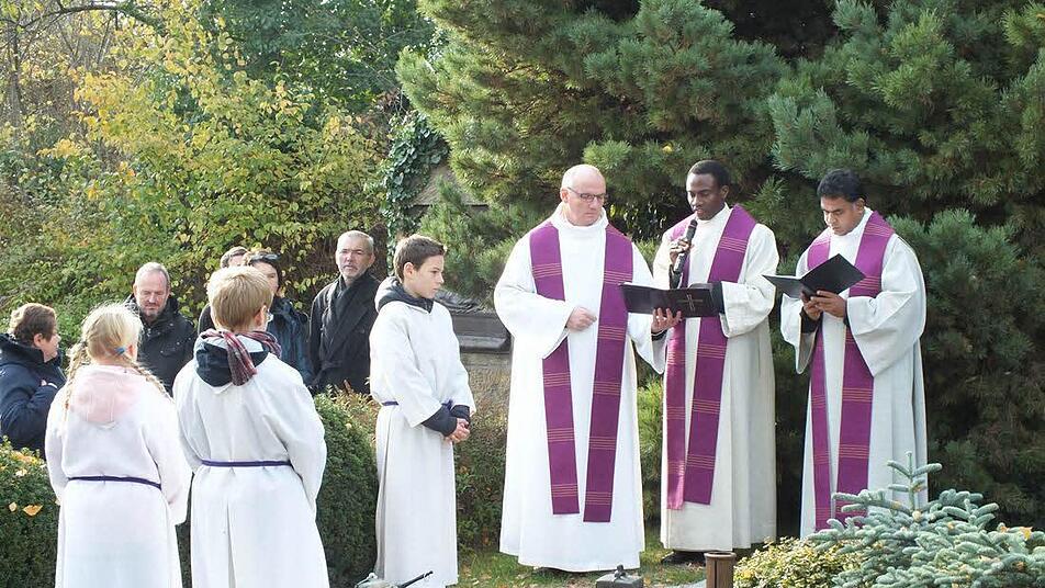 Zuvor mussten aus diesem Anlass natürlich die Gräber "gerichtet" werden. Jeder versucht mit einem besonders schmucken Grab diesen Feiertag zu begehen. Am Nachmittag wurde auch in diesem Jahr wieder der Friedhofgang auf dem alten Friedhof mit Geistlichen der katholischen Pfarreien von Herzogenaurach, Stadtpfarrer Helmut Hetzel, Jean Désiré Sawadogo und Pater Vincent Chettiar MSFS abgehalten.