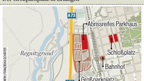 Der Großparkplatz in Erlangen wird einem neuen Wohnviertel weichen. Dennoch sollen die rund 1900 Parkplätze erhalten bleiben. Das zentrumsnahe "Filetstück" zwischen Bahnhof und A 73 ist Teil einer umwälzenden Stadtentwicklung.