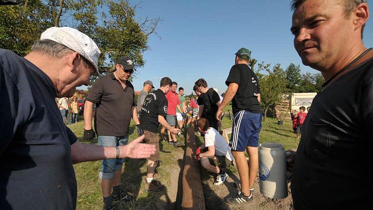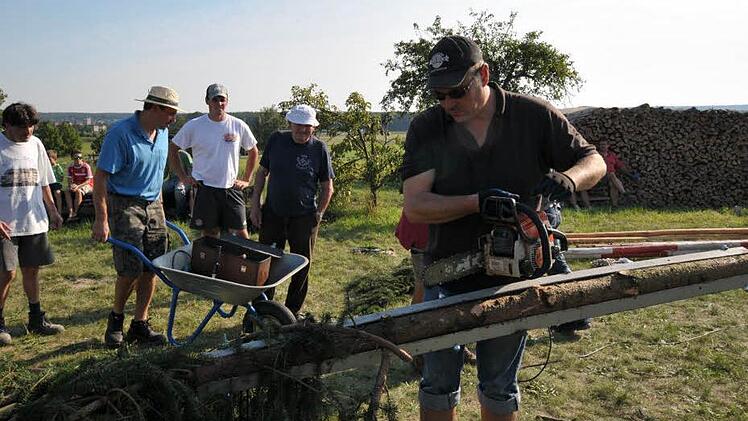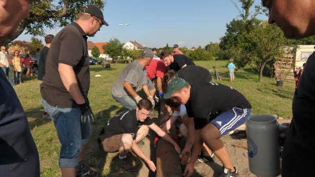 Unter dem Kommando von Dieter machten sich die Ortsburschen, unterstützt von den Hannberger Bürgern sowie Mitgliedern des Stammtisches "Die Nimmermüden" an die, bei sommerlichen Temperaturen schweißtreibende Arbeit, des Baum Aufstellens.