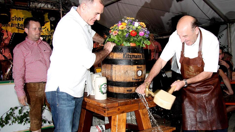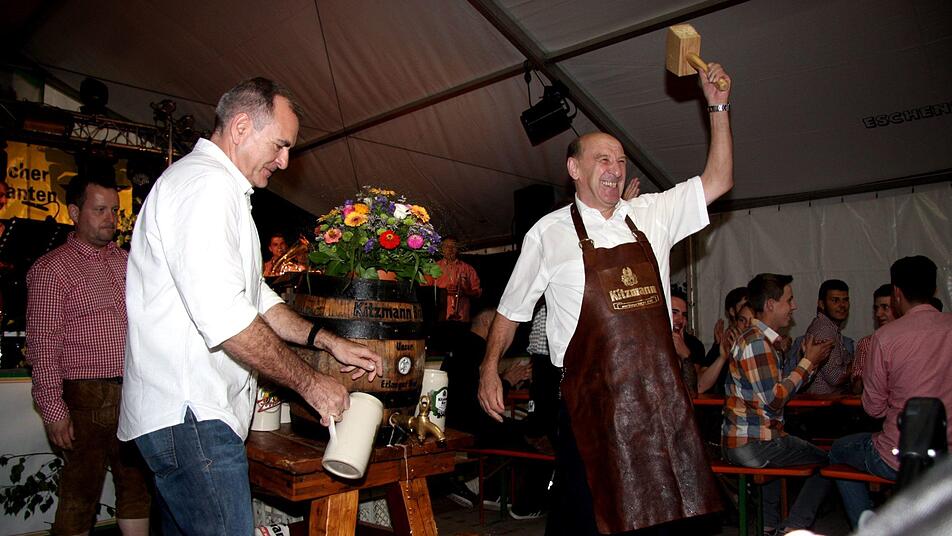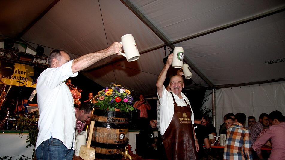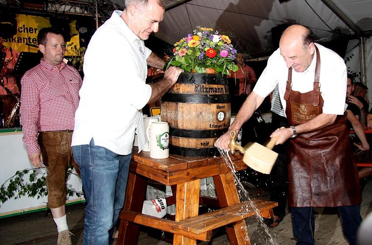 In einem völlig überfüllten Zelt eröffnete Bürgermeister Bernhard Seeberger mit drei Schlägen die diesjährige Kerwa. Den Anstich verfolgten auch Landrat Alexander Tritthart, Bürgermeister aus der Umgebung, Gemeinderäte, Vertreter von Vereinen und den örtlichen Geldinstituten.