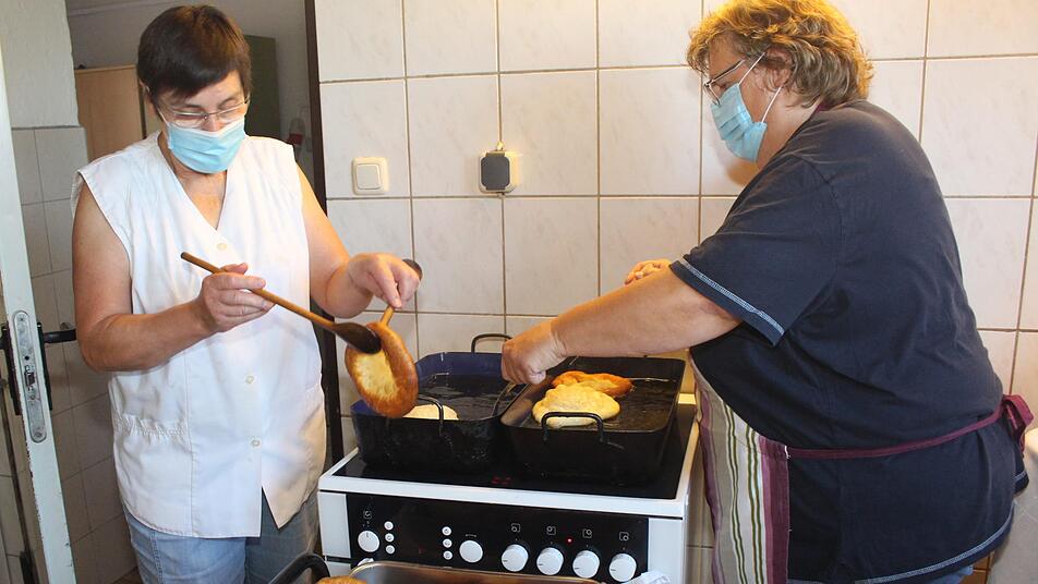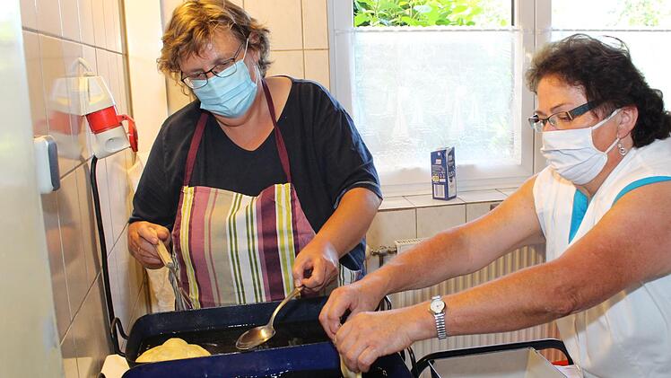 Die Krapfen-Bäckerinnen vom "Frauentreff" der evangelischen Kirchengemeinde hielt das nicht davon ab, ihre Spezialität auch im Corona-Jahr anzubieten. Schließlich backen sie "für Gottes Lohn" und noch dazu für einen guten Zweck: Das Gemeindehaus hinter der evangelischen Pfarrkirche Maria und Kilian wird renoviert und dafür wird Geld gebraucht.