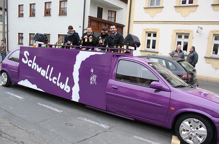 Schon einen Gag vorab hatte sich der "Schwallclub" aus Wachenroth - quasi die Altburschen - einfallen lassen, bevor der Kerwasumzug der jetzigen Ortsburschen am Sonntag zu seinen Ehren kam: Ein selbstgebauter "Supercorsa" fuhr zuerst die Straße entlang und wurde mit viel Beifall der zahlreichen Zuschauer belohnt. Das tolle Gefährt diente dann ordentlich abgestellt nach dem Umzug als originelle Bühne für die Kerwaspredigt, vorgetragen von Johannes Philipp. Seine "Premiere" hatte das in trendigem Lila gehaltene Gefährt schon am Vortag beim Einholen der Kerwasficht'n gehabt: Es transportierte die nach getanem Fällwerk unabdingbare Brotzeit in den Wald.