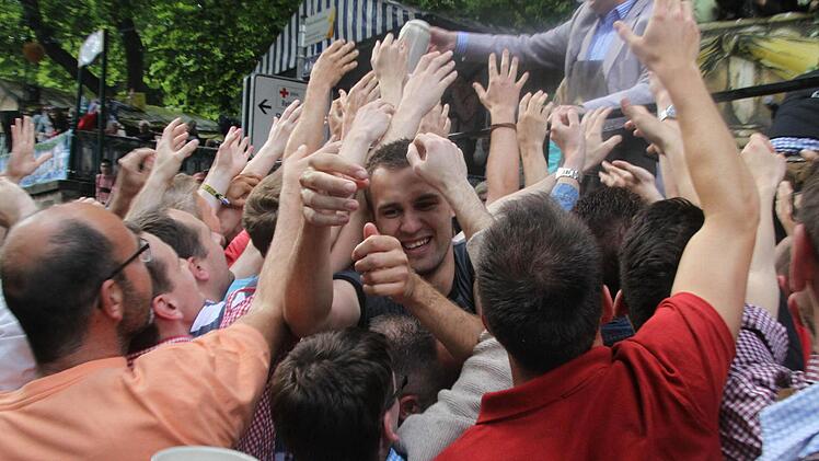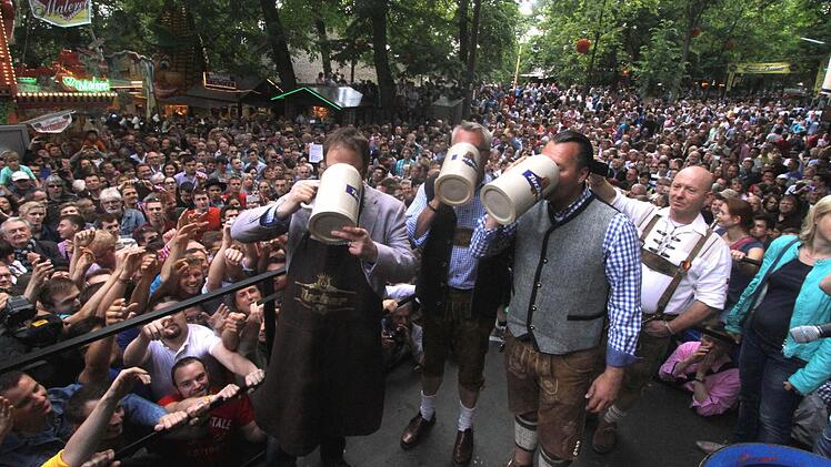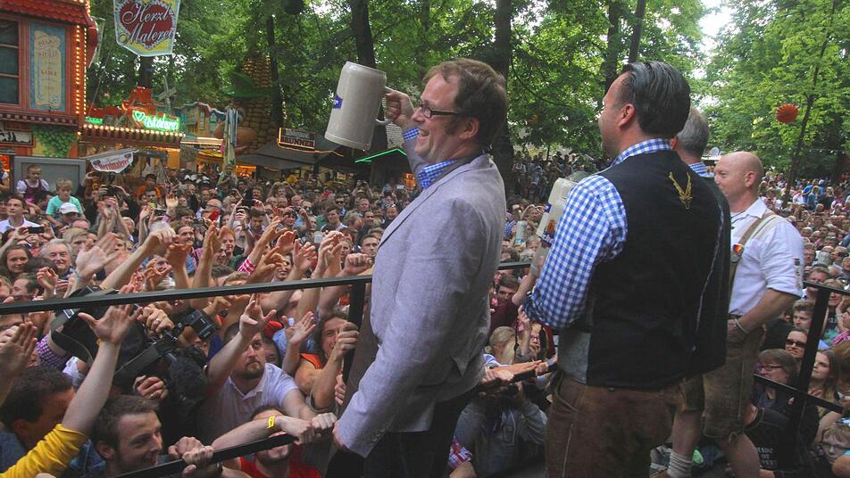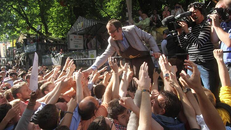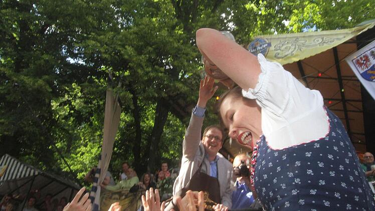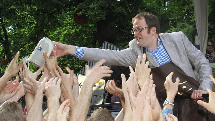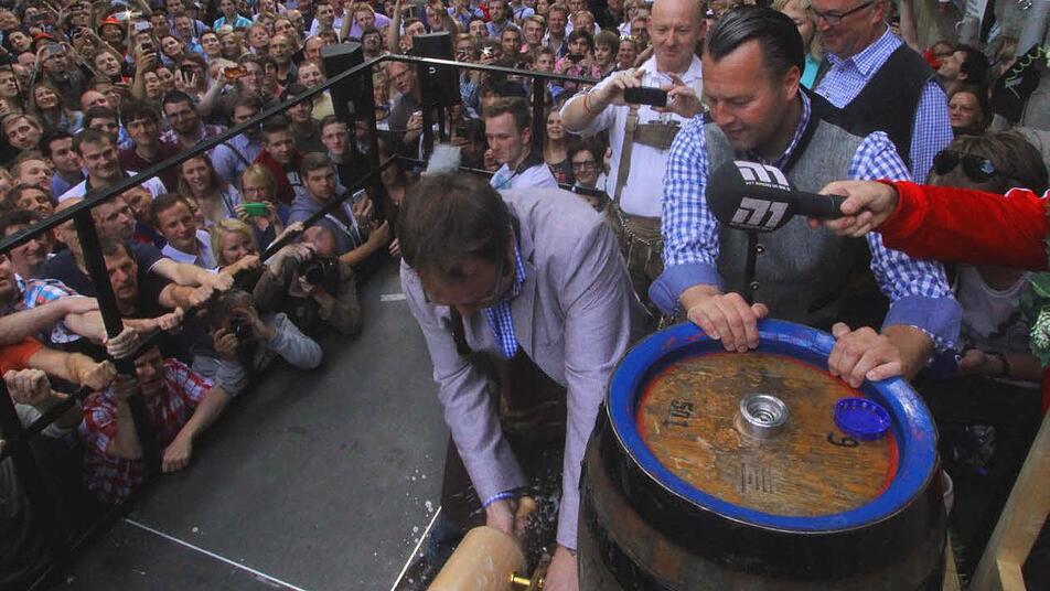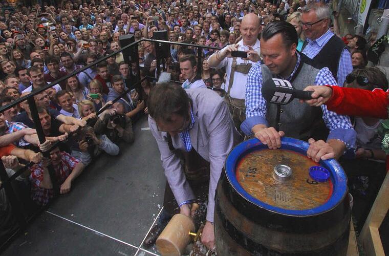 Gut gelaunt betrat der neue Oberbürgermeister Florian Janik die Bühne an der "T-Kreuzung". Erstmalig durfte er nach 18 Jahren Balleis'scher Bergherrschaft den Hammer in die Hand nehmen, um das erste Fass Freibier anzustechen.
