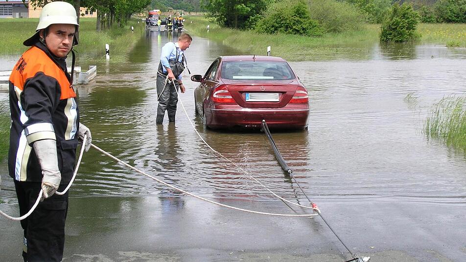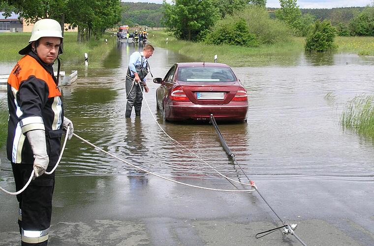 "Der vor mir hat es doch auch geschafft", meinte ein älterer Herr, als er am Fronleichnamstag mit seiner Beifahrerin aus seinem Mercedes in die kühlen Fluten stieg. Das Aischwasser war bereits bis auf Sitzhöhe ins Fahrzeug eingedrungen. Die Gremsdorfer Feuerwehr zog den Mercedes wieder aus dem Hochwasser.