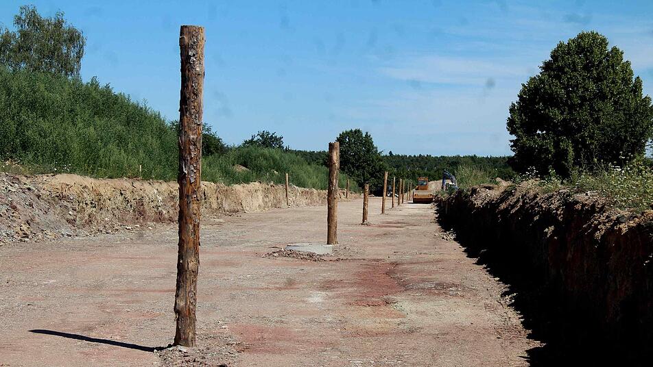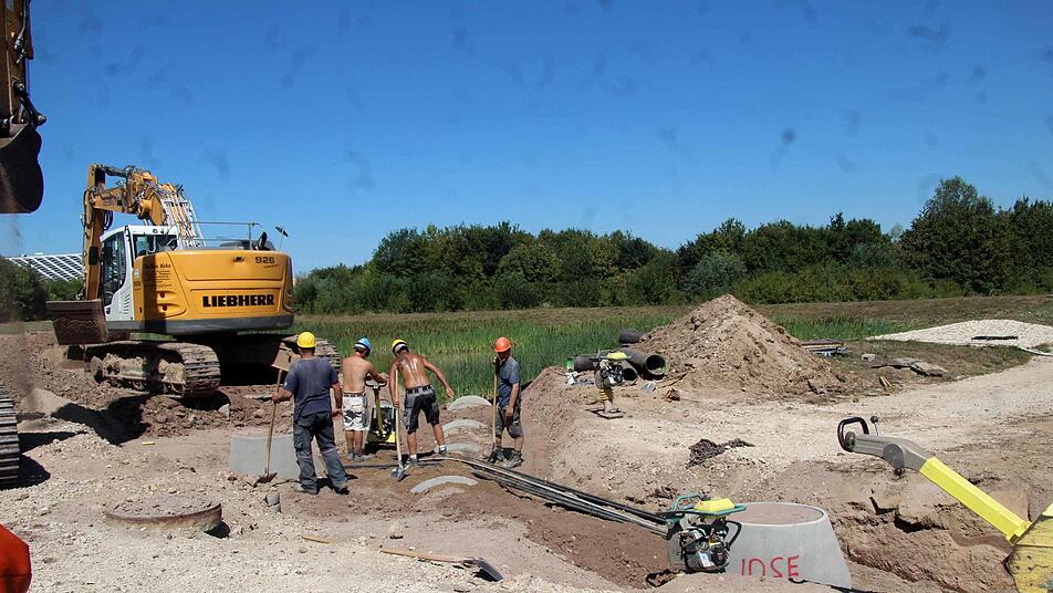 In die Straßen wird noch die Oberflächenentwässerung eingebaut und die Hausanschlüsse sind an den in der Straße stehenden Holzpfosten erkennbar. Auch die Regenrückhaltebecken für das Oberflächenwasser sind fertig, sie bilden bei starken Regenfällen den Puffer für den Vorfluter Aurach.