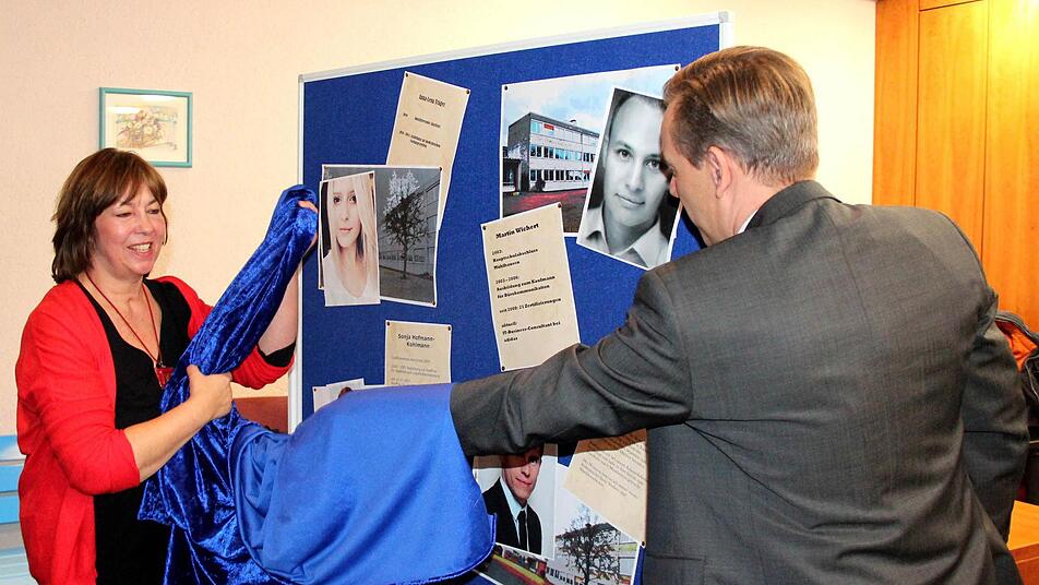 Am vergangenen Mittwoch Abend begrüßte Rektorin Gudrun Boss etliche der erfolgreichen Ehemaligen, Kollegen, Vertreter des Elternbeirats, des Fördervereins der Schule, die drei Bürgermeister des Schulverbandes Friedrich Gleitsmann (CSU/BB), Hans Beck (WBS) und Klaus Faatz (CSU), Georg Mönius, Chef der Raiffeisenbank und Kollegen der Zweigstelle, aber auch interessierte Eltern zur Ausstellung in der Raiffeisenbank Seebachgrund in Mühlhausen.