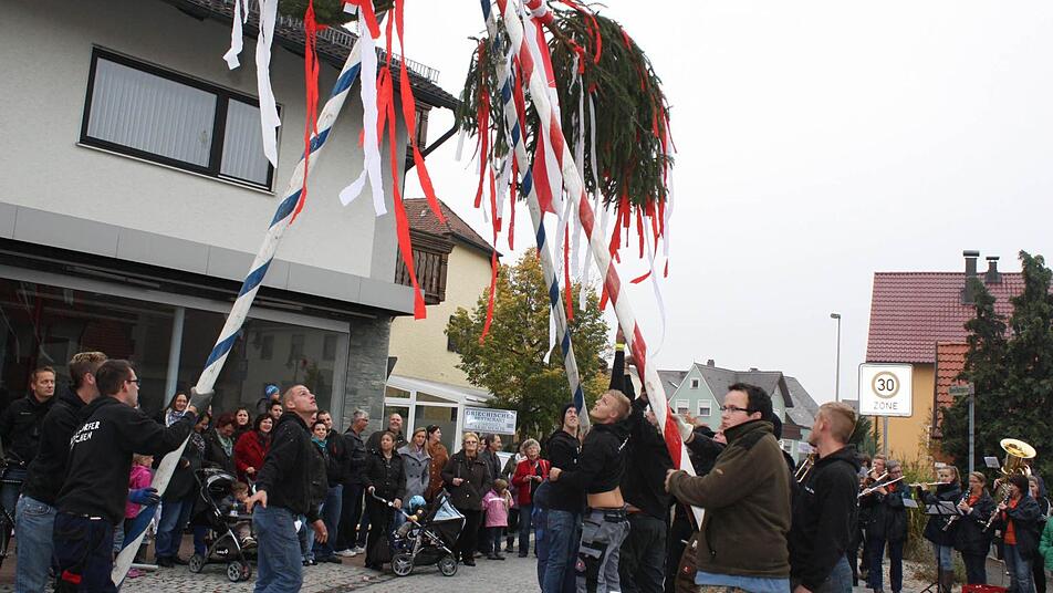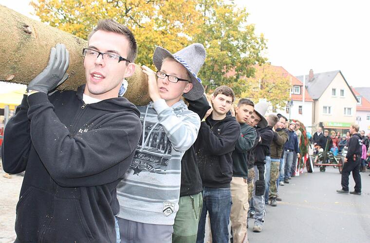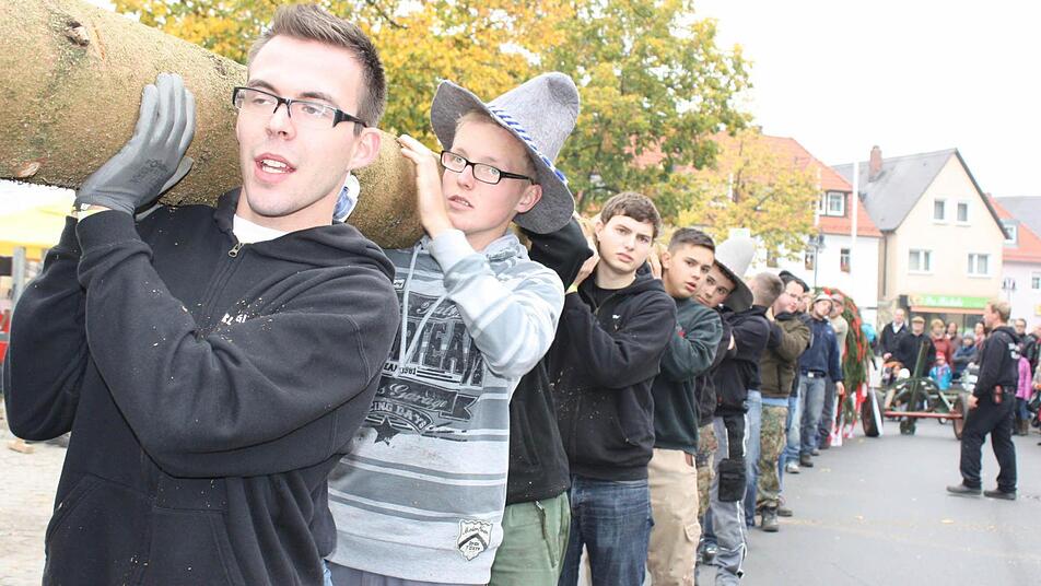 Der Baum stand innerhalb einer Stunde Die jungen Kerwasburschen hatten die Sache voll im Griff und der Baum stand innerhalb einer guten Stunde. Die ursprünglichen Väter der Kerwa, zwei Stammtischgemeinschaften und tatsächlich Väter oder Onkels der heutigen Kirchweihjugend, standen zwar noch dabei und gaben ab und zu noch ein paar Tipps, aber sie haben die jungen Leute, die von klein auf dabei waren, so gut angelernt, dass die ihre Aufgabe inzwischen perfekt beherrschen. Begleitet wurden der Einzug und das Aufstellen der Fichte traditionell von den Adelsdorfer Musikanten.