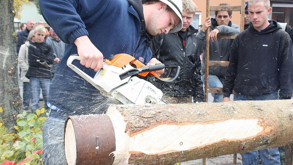 Da wurde nicht genau genug gemessen in Adelsdorf - der Baumstamm war etwas zu dick beim Fichtnaufstellen in Adelsdorf am Samstag. Trotz redlichen Bemühens wollte er nicht in die vorgefertigte Halterung passen. So musste also der Flo ran mit der Kettensäge und passend machen, was nicht passen war. "Schadt nix", sagte er "solange sonst alles in Ordnung ist". Und da konnte er als einer aus dem Team der Verantwortlichen für die Burschentradition sich nicht beklagen. Sonst passte alles.