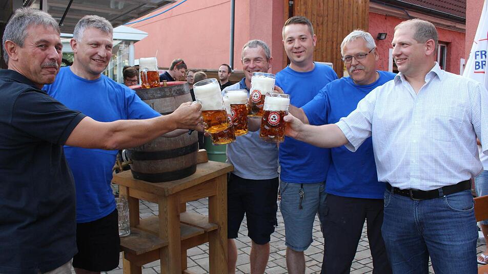 Drei Schläge und der Zapfhahn saß, ohne dass ein Tropfen daneben ging. Beim dritten Schlag allerdings löste sich der Schlegel vom Stiel. Ein gutes Omen vielleicht, sofern man daran glaubt, dass es Glück bringt, wenn etwas entzwei geht. Das erste Fass war natürlich Freibier, das Vorsitzender Hermann Gamperling gerne an seine Gäste verteilte.