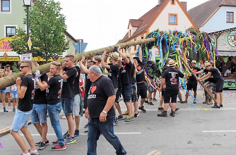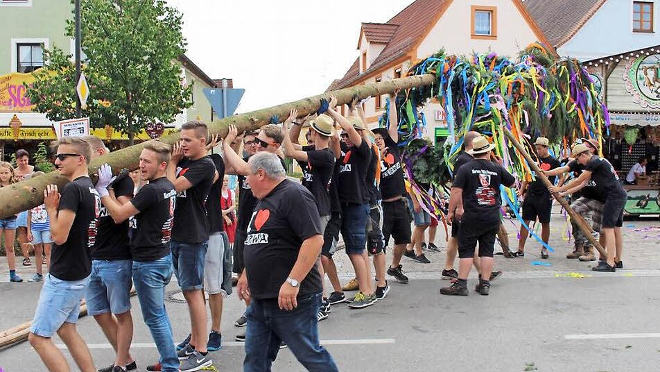 Ein Highlight, das viele Besucher miterleben wollten, war das Aufstellen der Kerwasfichte am Samstag. Über einen Mangel an Kerwasjugend kann sich Mühlhausen wirklich nicht beklagen. Schon am Vormittag machten sie sich auf den Weg, um die Fichte zu schlagen und Kränze zu binden. Zu den Klängen der Weingartsgreuther Blaskapelle wurde der stattliche Baum in den Ort gefahren und unter den Kommandos von "Osser" aufgestellt. Mit den Kerwasliedla übertrumpften sich die Burschen gegenseitig. Sehr spezielle Liedla übrigens und nicht ganz druckreif. Stellte sich noch die Frage nach der Länge des stattlichen Baumes. Die Antwort kam prompt: "Vierzig Maß ..."