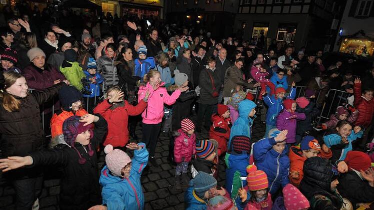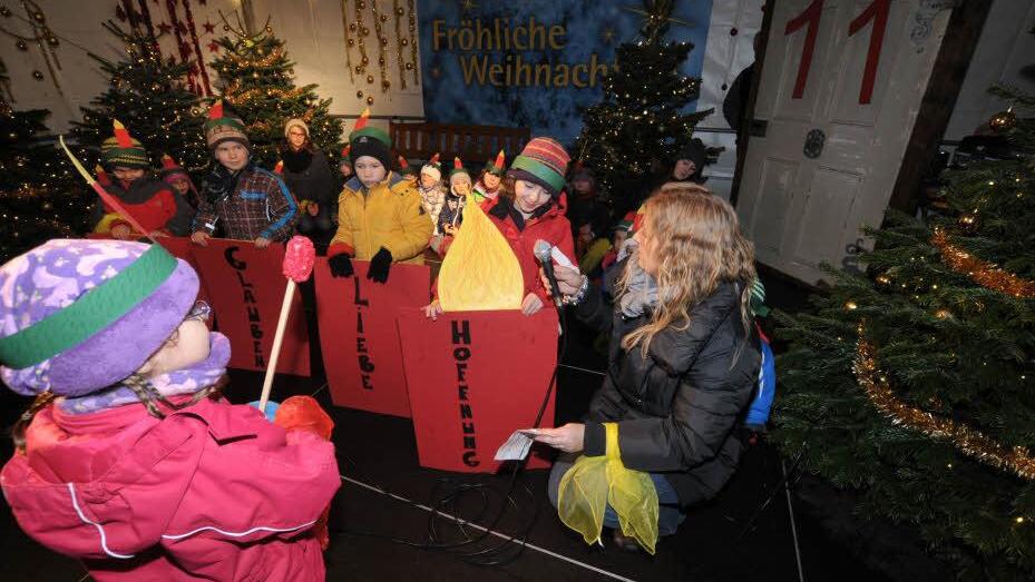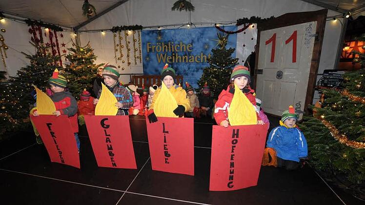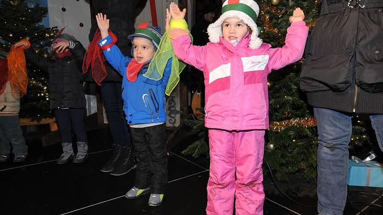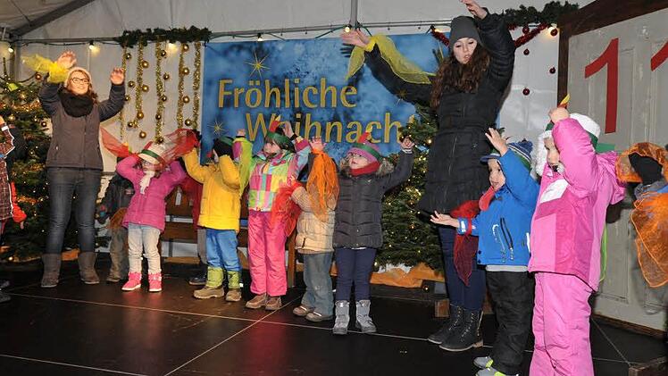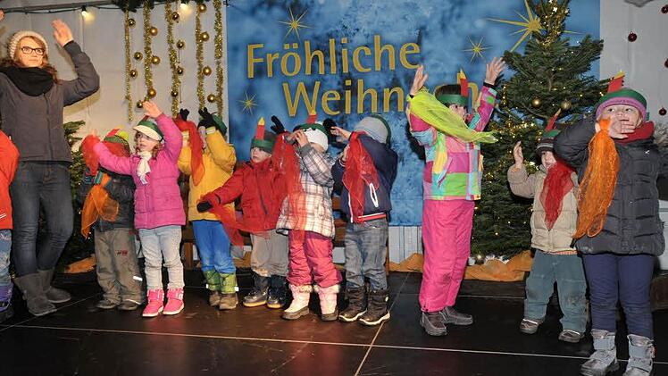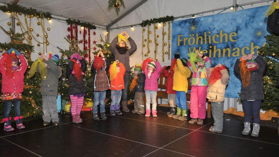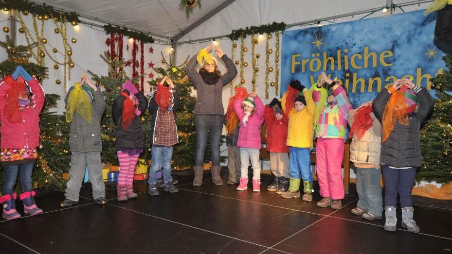Die Kinder der Kindertagesstätte St. Elisabeth, Hammerbach mit ihrer Leiterin Sandra Zenger waren am Mittwoch die Akteure auf der Bühne am Marktplatz in Herzogenaurach. Insgesamt zeigten 22 Kinder im Alter von drei bis sechs Jahren einen Kerzentanz. Dies passt zur Adventszeit, in der Kerzen angezündet werden und in der Dunkelheit brennen.