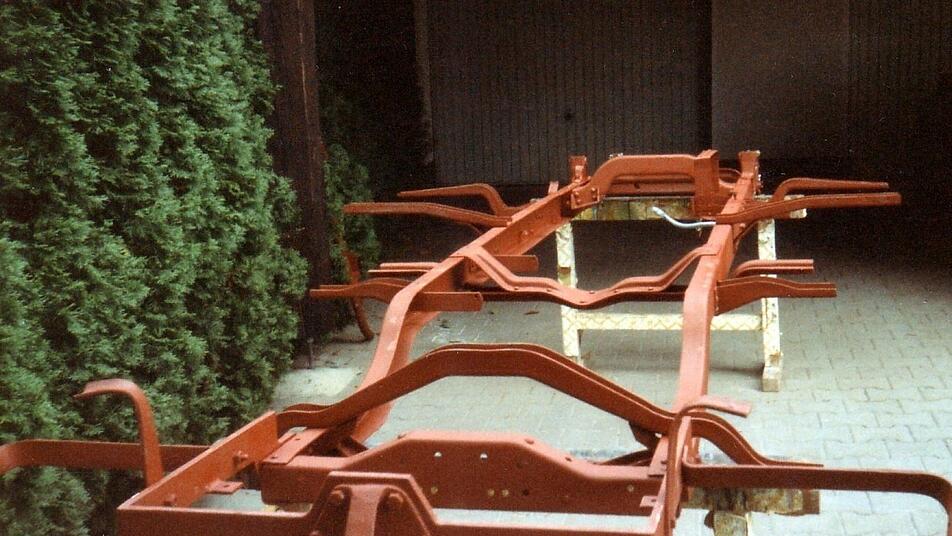 Endlich konnte er den Wagen nach Hause holen und als erstes musste er ihn in Aisch "entblättern" bevor er ans Restaurieren denken konnte. Ein Freund hatte ihm auch dringend geraten, das Vehikel bis auf den Rahmen ganz auseinander zu nehmen, denn die vorhandenen Karosserieschäden waren leider größer als erwartet. Das Dach war nach oben offen wie bei einem Cabrio und der Zustand der Bordelektrik war miserabel.