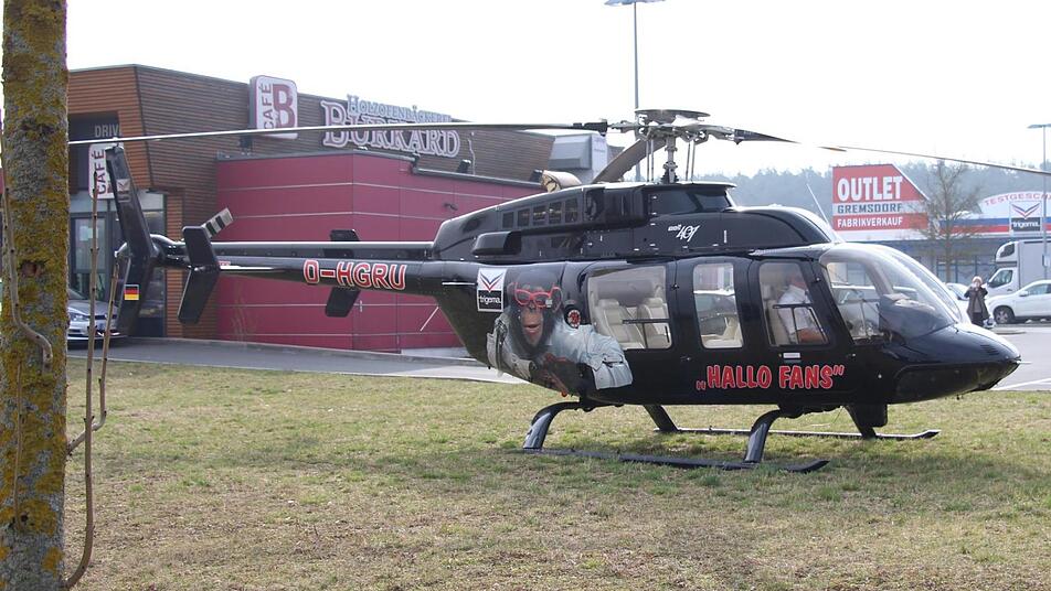 Wilhelm ist Pilot der Familie Grupp von der schwäbischen Textil-Firma Trigema. Die mit dem Schimpansen. Auch auf der Seite des Hubschraubers prangt das Maskottchen. Er fliege seit 25 Jahren gewerblich Hubschrauber, sagt der 51-Jährige. Seit zwei Jahren fliege er für die Grupps. Am Mittwoch brachte er Elisabeth Grupp zur geschäftlichen Visite in die Filiale im Gremsdorfer Gewerbegebiet.