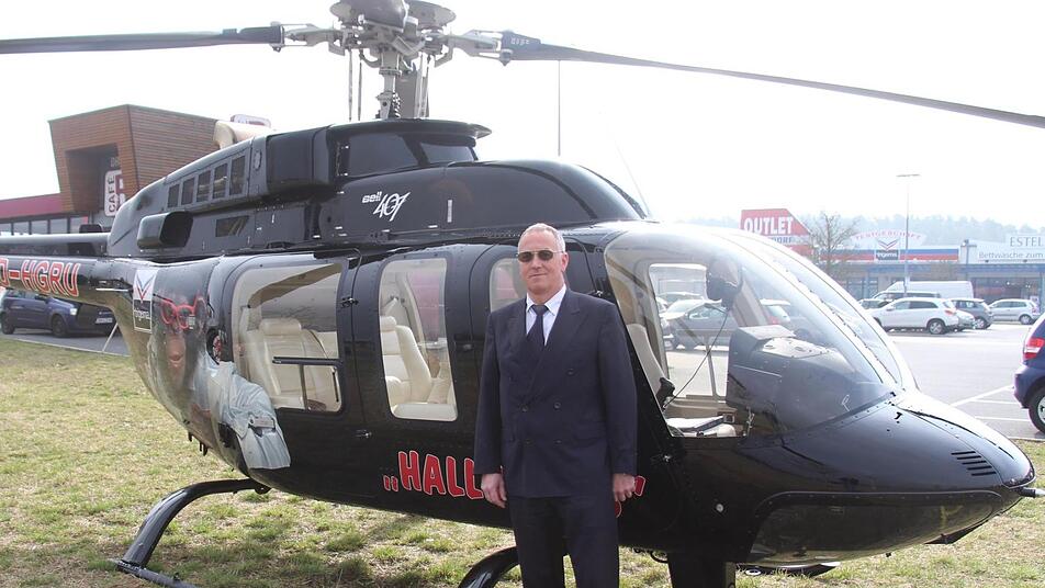 Es gibt sicher schlechtere Jobs, als den, mit dem sich Dirk Wilhelm seine Brötchen verdient. Im dunklen Zweireiher mit Krawatte und mit einer Sonnebrille auf der Nase steigt er am Mittwochvormittag aus dem Hubschrauber. Im Inneren helle Ledersitze. Sein luftiger Arbeitsplatz vorne und die Plätze hinten schauen durchaus bequem aus.
