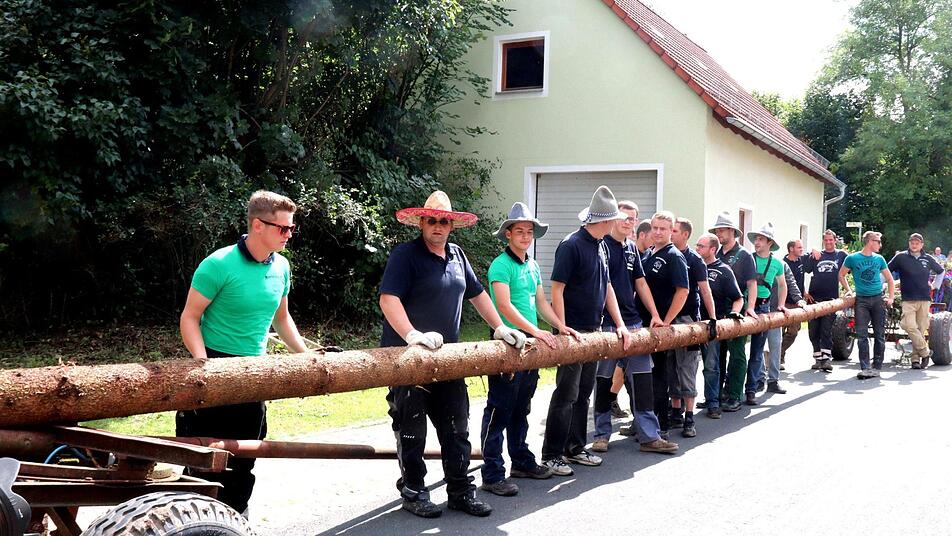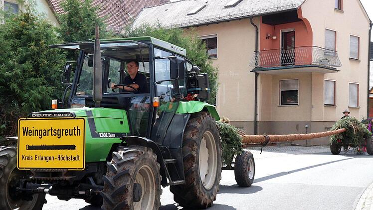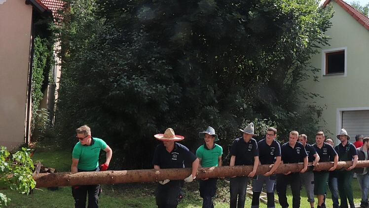 Am Samstag legten sich die 25 Kerwasburschn und die fünf Kerwasmadli mächtig ins Zeug. "Kurz vor 11 Uhr sind wir im Wald losgelaufen", erklärte der Kerwasbursch mit Namen "Glaa Geyer". Gegen 15 Uhr erreichten sie dann, voran die Weingartsgreuther Musikanten, gut gelaunt mit ihrem geschmückten Baum das Dorf. Beim Kronensaal stemmten sie mit vereinten Kräften unter der Regie von Niklas Geyer, dem Kerwasbaam-Capo, den etwa 20 Meter hohen Kerwasbaum in die Höhe. Der stand in weniger als einer Stunde kerzengerade da.