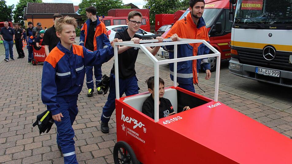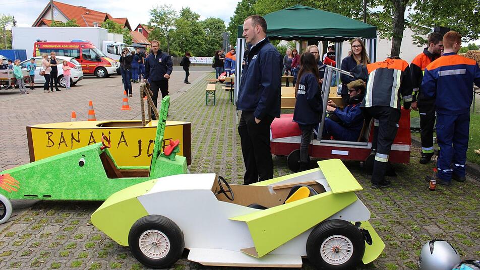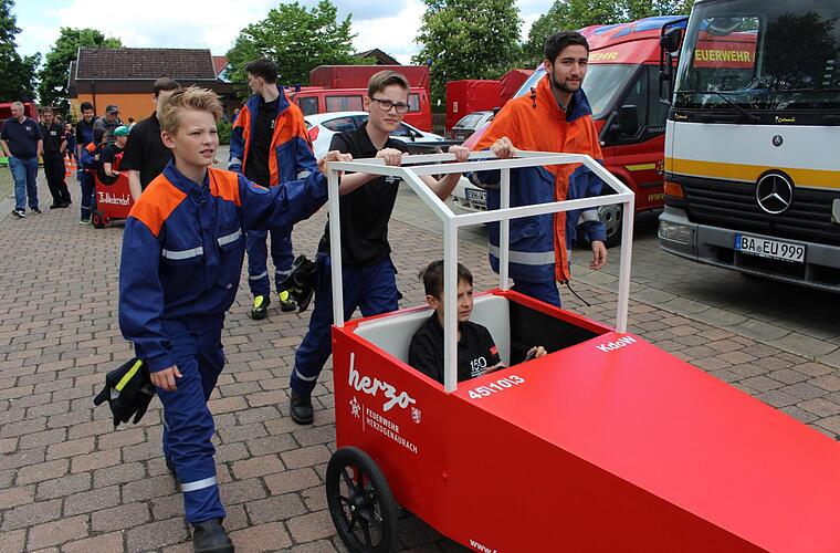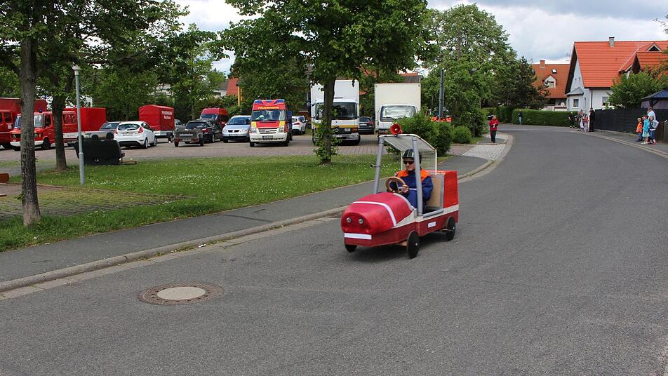 Wachenroth Nachwuchsfeuerwehrler aus Herzogenaurach, Niederndorf, Adelsdorf, Frimmersdorf, Marloffstein, Neuhaus, Röttenbach und natürlich aus Wachenroth zum Seifenkistenrennen an. Beim Anblick der fantasievoll gestalteten Fahrzeuge wurde klar: Da ging es nicht ausschließlich um Platz und Sieg. Man wollte die selbst gebauten Vehikel auch gebührend bewundert wissen.