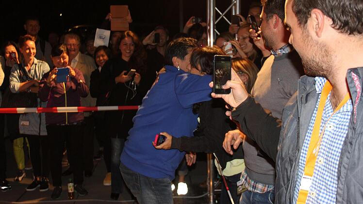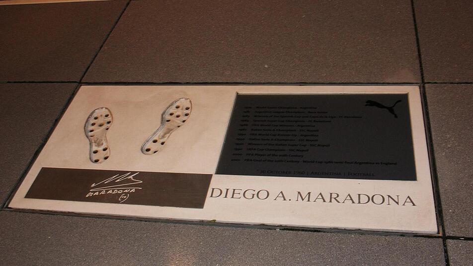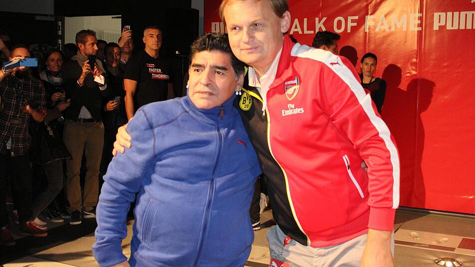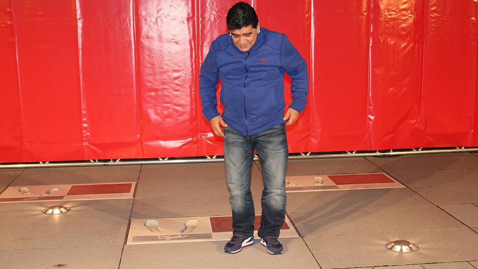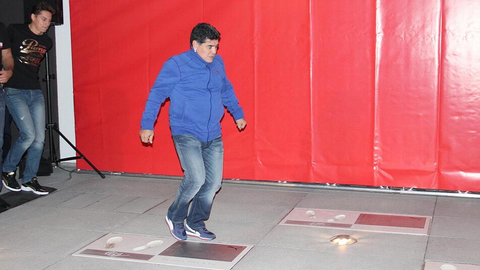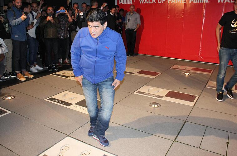 Umarmung mit zwei Fans Inzwischen ist der exzentrische ehemalige Fußballstar auch Teil des Walk of Fame auf der Puma-Plaza. Zunächst stellte er sich in einem internen Meeting den Mitarbeitern vor, anschließend weihte er seinen bereits angefertigten Fußabdruck ein. Somit ist Maradona jetzt in Herzogenaurach neben anderen Sportgrößen wie Michael Schumacher, Boris Becker oder Lothar Matthäus verewigt. Für zwei weibliche Fans gab es sogar noch kurze Umarmungen, ehe der extrovertierte Argentinier wieder in den Katakomben des Hauptquartiers verschwand.