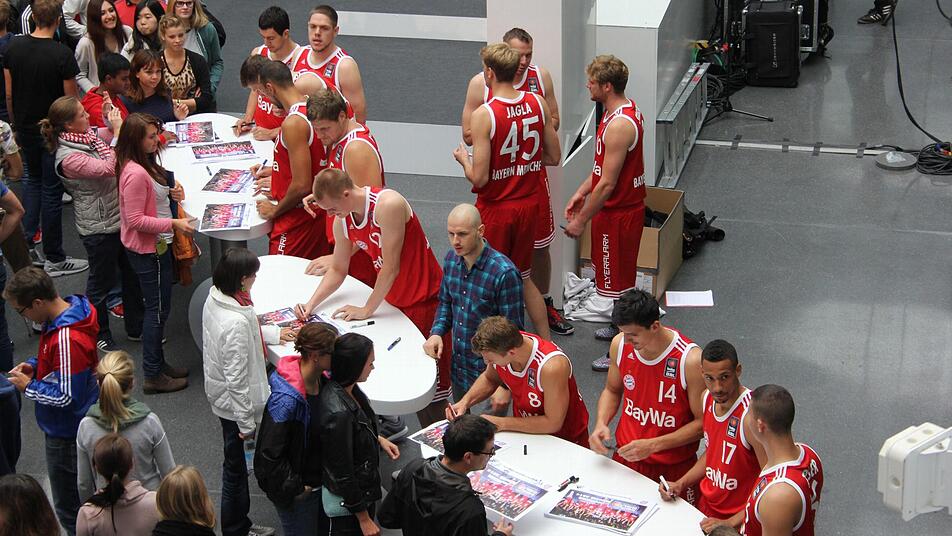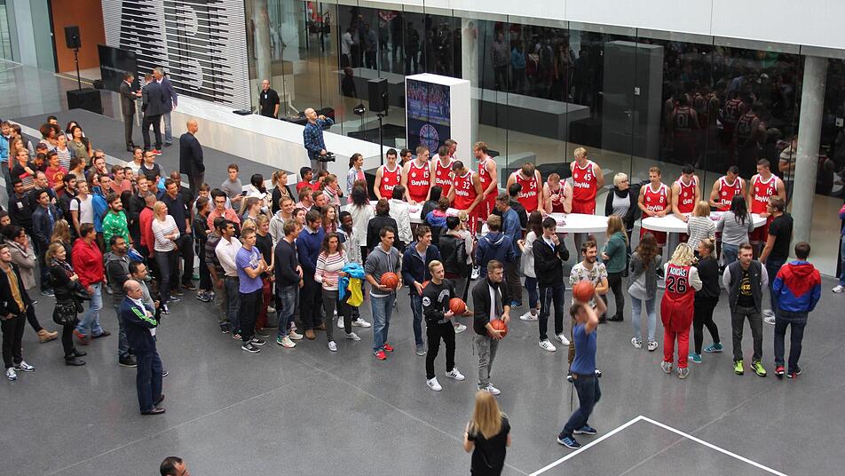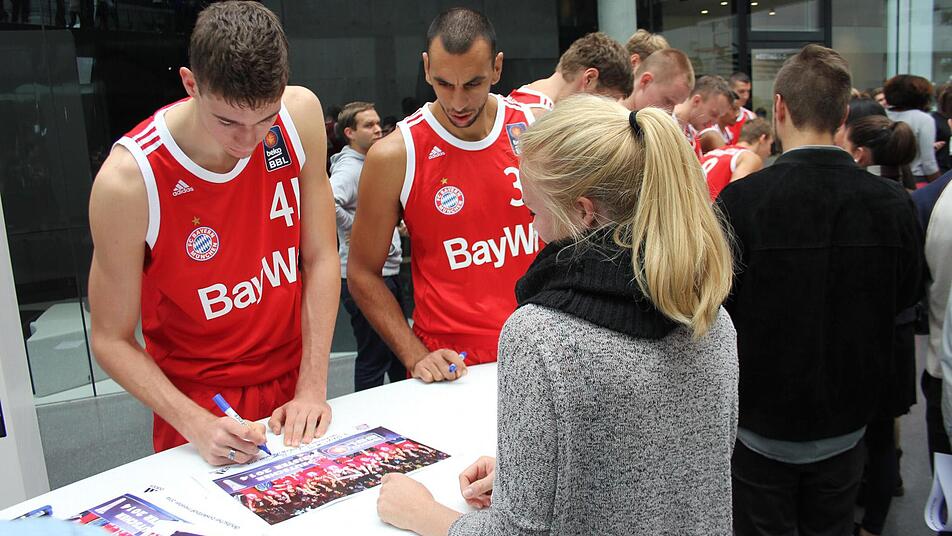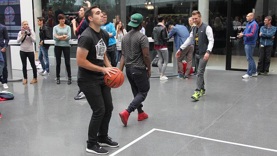 Im Anschluss des recht kurzen, offiziellen Teils standen die Riesen in Rot ihren Fans auch noch für Fotos oder Autogrammwünsche zur Verfügung. Dabei konnten sie sich auch ein Bild von den Wurffertigkeiten der Adidas-Mitarbeiter machen. Diese zeigten den Profis ihr Geschick unter dem Korb.