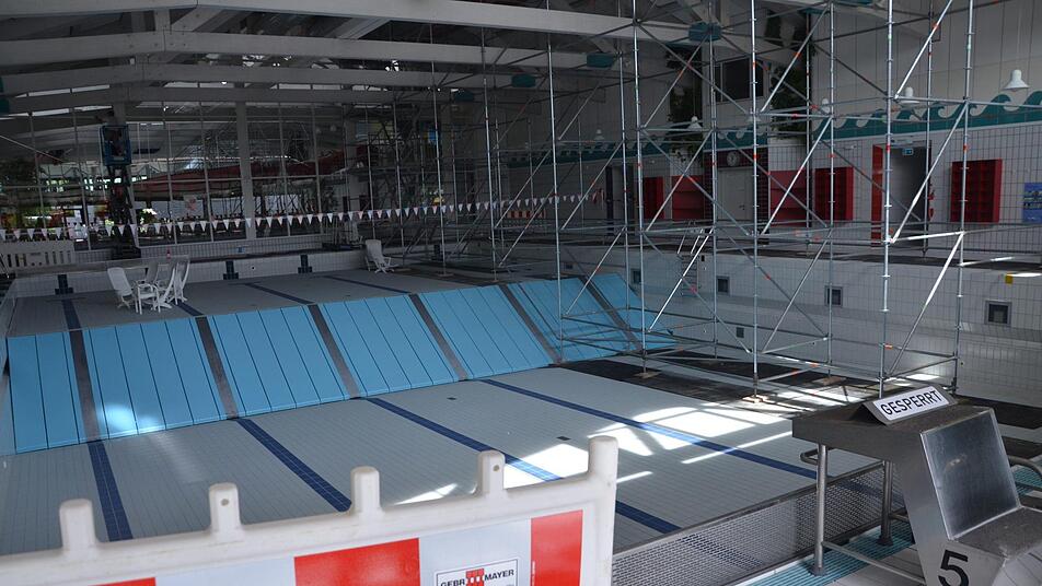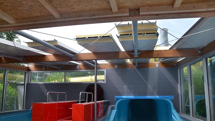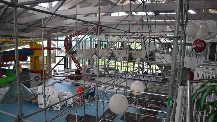 Im Rutscheneinlauf werden Holzbalken ausgetauscht und das Flachdach erneuert. Im Wellenbecken musste ein großes Gerüst aufgestellt werden, damit unter dem Dach Rauchklappen eingebaut werden können, die sich im Brandfall öffnen. Das Brandschutzkonzept sieht unter anderem noch Lamellenfenster und eine Sprinkleranlage im Umkleidebereich vor. Die gleichen Maßnahmen sind im Bereich des Sportbeckens und der Kinder-Abenteuerlandschaft erforderlich. Dort wird außerdem eine Trennwand zwischen den beiden Flächen eingebaut. Und eine neue beheizte Sitzbank gibt's auch. Anschließend wird die Badelandschaft neu gestaltet.