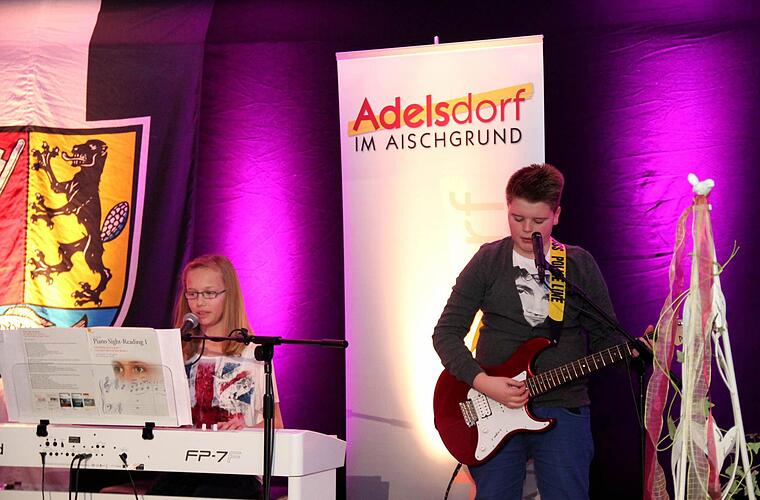 Jana und Oliver, ein junges Duo, das im vergangenen Jahr beim Wettbewerb der Volksschule " Adelsdorf sucht das Supertalent" den ersten Platz belegt hatte, eröffneten musikalisch den Abend mit dem passenden Song "People help the People" von Birdy.