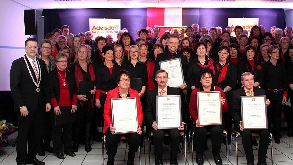 Am vergangenen Freitag Abend verlieh Adelsdorfs Bürgermeister Karsten Fischkal (FW) im Namen des Gemeinderates in der Aischgrundhalle eine Bürgermedaille, drei Ehrenurkunden an verdiente Persönlichkeiten und eine Ehrenurkunde für Gruppen an den Musik- und Gesangverein. Der ganze Abend war ein großes Lob auf das Ehrenamt.
