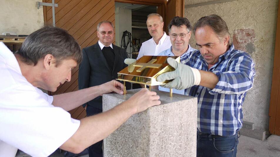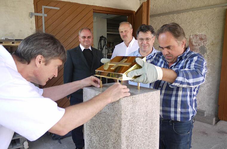 Weiche Handschuhe schützen die Hände von Goldschmied Alois Plätzer, als er zusammen mit Steinmetz Herbert Sailer den Reliquienschrein auf der Steinstele für die St. Anna-Kirche befestigt. Man könnte es auch umgekehrt sehen: Plätzer schützt das Behältnis aus vergoldetem Messing vor den Fingerspuren der Arbeit.
