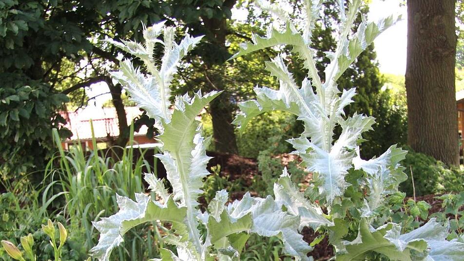 Der große Kompost ist von Johannisbeersträuchern umgeben, zwischen denen auch große Silberdisteln hervorragen. Der Kompost wird von Ewald Hausmann immer wieder umgesetzt und es entsteht bester Humus.