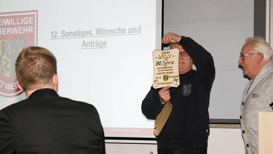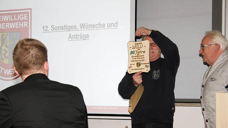 Am Ende der Versammlung hatte Georg (Bibo) Maier noch eine Überraschung für Wilhelm Oed parat. Er überreiche eine Holztafel: "Danke Willi für 30 Jahre als Kommandant der Feuerwehr Weisendorf - Deine Feuerwehrkameraden". Zuvor gab es vom Bürgermeister für beide Kommandanten a.D. noch kräftig Präsente.