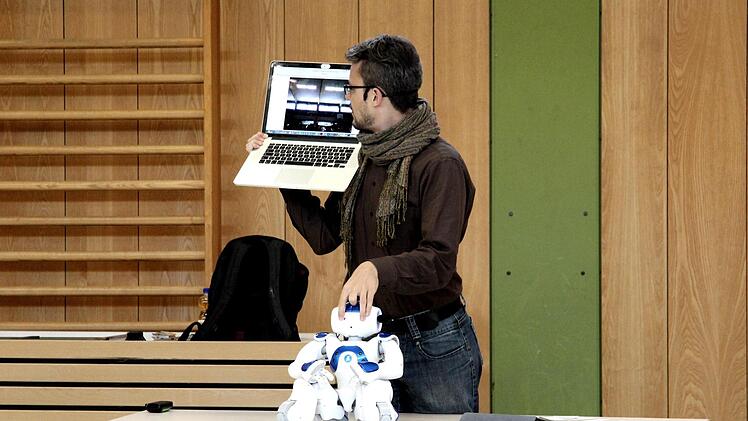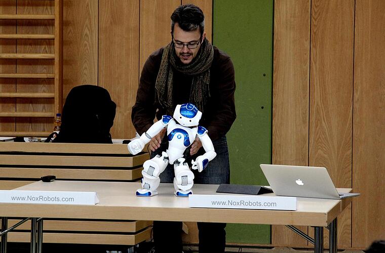 Zu Beginn kauert Nao in Ruhestellung auf dem Tisch und Tobias Danzer muss in aufwecken. Nach ein paar Klicks am Laptop raffte sich Nao auf, stellte sich gemächlich auf seine Füße und dann ging es rund: Zum Youtube-Hit "Gangnam Style" tanzte der Roboter mit erhobenen Armen und wackelte wild mit seinen Plastikhüften.