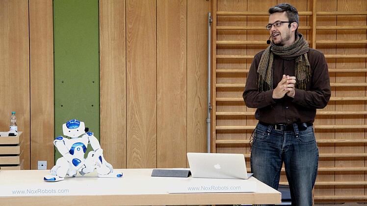 Klar, dass Tobias Danzer aus Pforzheim mit Nao und dessen rundem Kopf mit blinkenden Kulleraugen auf die volle Begeisterung der Schülerinnen und Schüler stieß. Natürlich gab es viele Fragen und Tobias Danzer versuchte, so viel wie möglich zu beantworten. Als Nao einem Schüler auch noch ein Geburtstagsständchen sang, kannte die Begeisterung natürlich keine Grenzen mehr. Wie Danzer erläuterte, ermöglichen es Nao 25 Freiheitsgrade, präzise, denen eines Menschen ziemlich ähnliche Bewegungen auszuführen. Integrierte Lautsprecher und eine Spracherkennung erlauben es dem rund 5 Kilogramm schweren Roboter in 19 Sprachen zu kommunizieren. "Natürlich kann er Russisch, Polnisch und Arabisch", beantwortete Tobis Danzer die auf ihn einprasselnden Fragen. Tanzend unterhielt er die Schüler und stand auch von selbst wieder auf, als ihn sein Herr und Gebieter schubste. Dass er auch noch kitzelig ist und er lauthals lachte, als ihn Tobias Danzer an den Füßen kitzelte, war ein lustiger Höhepunkt der Show.