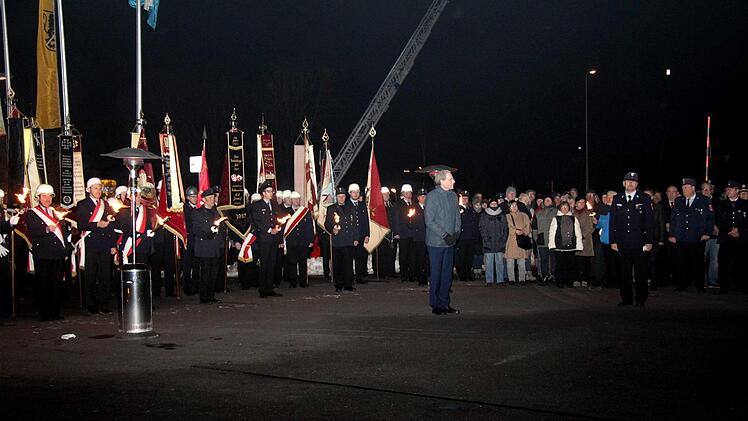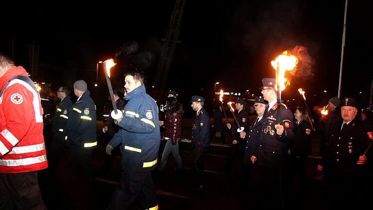 Nach dem Festakt in der Puma-Plaza (Seite 15) formierten sich die Ehrengäste und Feuerwehren aus dem gesamten Landkreis zum Fackelzug in über Flughafenstraße, Postkreisel und Hans-Maier-Straße zur Feuerwache. Der Fackelzug wurde vom Spielmannszug der Freiwillen Feuerwehr Höchstadt und der Wagnertanzgilde 1560 Spielmanns- und Fanfarenzug Bad Windsheim begleitet. Und zu Beginn des Zapfenstreiches mit "Gänsehautfeeling" zog die "Perlenkette" auf: Feuerwehrleute sowie Vertreter der Hilfsorganisationen mit Fackeln, die vor den Fahrzeughallen der Feuerwache Aufstellung nahmen.