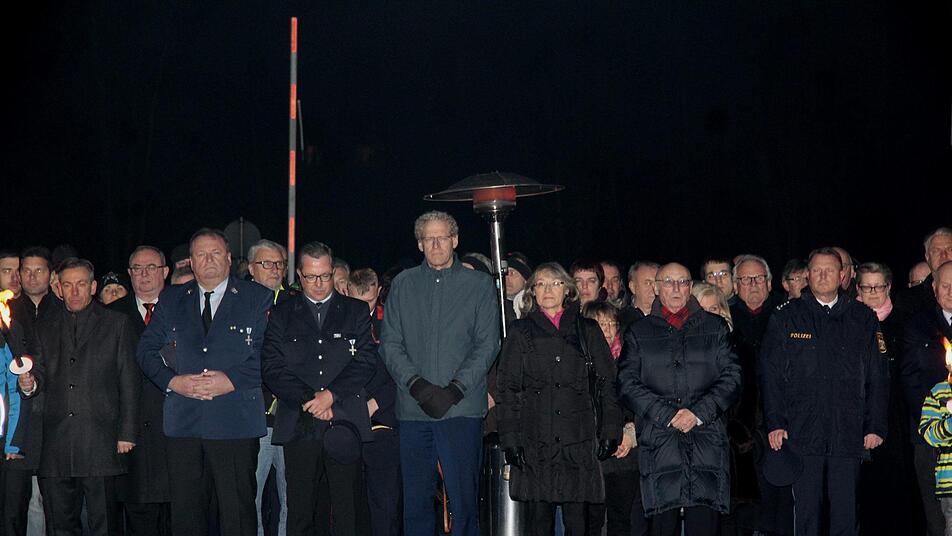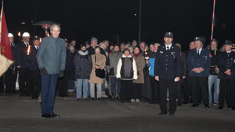 "Ehrenformation halt!", schallt es vom Kommandanten Rainer Weber. Nach weiteren Kommandos richtet sich die Formation zur Begrüßung des Bürgermeisters German Hacker und Landrat Alexander Tritthart aus. Nach der Aufstellung der Akteure und Fackelträger überquert der "Kommandierende" Weber im zackigen Schritt den Platz und meldet den beiden "abnehmenden" Schirmherren "Ehrenformation angetreten".
