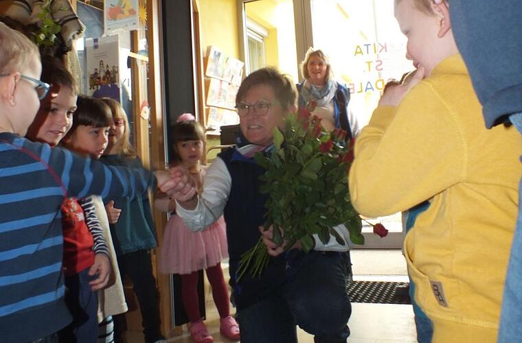 Die Kinder überreichten Annette Blum zum Abschied rote Rosen und eine Mappe mit gemalten Bildern.