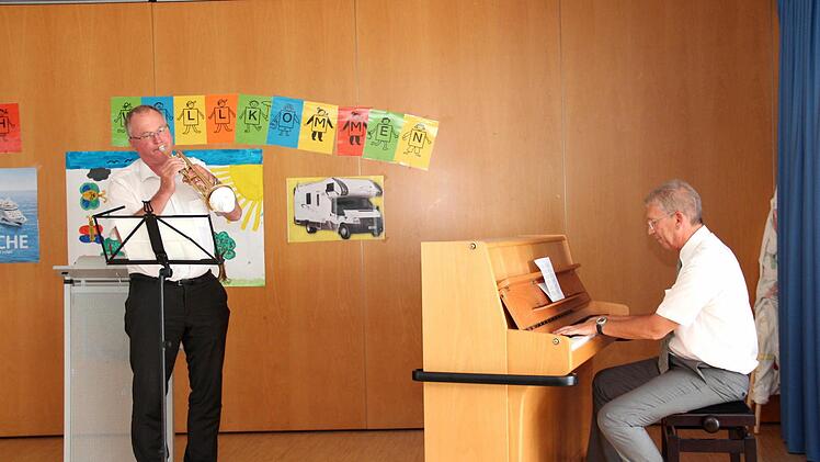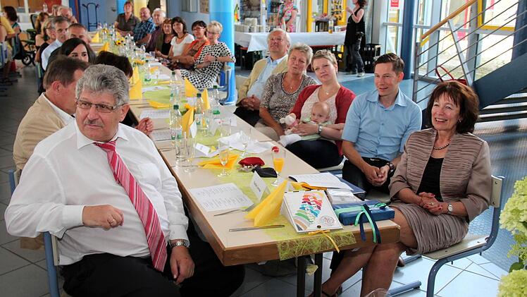 Vor der Abschiedsrede der tief gerührten Rektorin brachten sich auf deren Wunsch Martin Oberle und Michael Ulbrich musikalisch mit Trompete, Klavier und Gesang zur Freude aller Anwesenden ein. Lommer blickte selbst noch einmal zurück in ihr Leben. Hier wechselten sich gute mit traurigen Erlebnisse ab. "Ich fürchtete mich seit langem vor diesem Augenblick", begann sie ihre Rede. "Ich hab schon so viele Verabschiedungen mitgemacht, aber das ist etwas anderes als die eigene Abschiedsrede zu halten." Sie bedankte sich bei allen für die vielen Geschenke, aber besonders bei ihrer Konrektorin, dem Kollegium, dem gesamten schulischen Personal und nicht zuletzt bei ihrer Familie, dem Ehemann Stefan, dem Sohn Peter mit Ehefrau Sabine nebst Baby Charlotte und bei allen, die zum Gelingen dieser schönen Verabschiedung einen Beitrag geleistet hatten. Irmhild Lommer wünschte der Schulfamilie weiterhin Gottes Segen und viel Glück. Anschließend lud sie zu einem leckeren Buffet, ausgerichtet von einem örtlichen Ca
